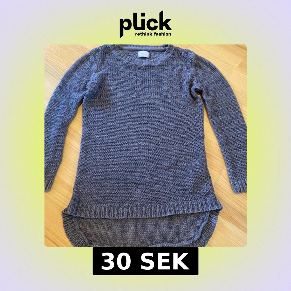 Grå stickad tröja med lång ärm och rund halsringning. Tröjan har en längre baksida än framsida. Saknar lappar men uppskattar strl till 128 då dottern rensat sin garderob.