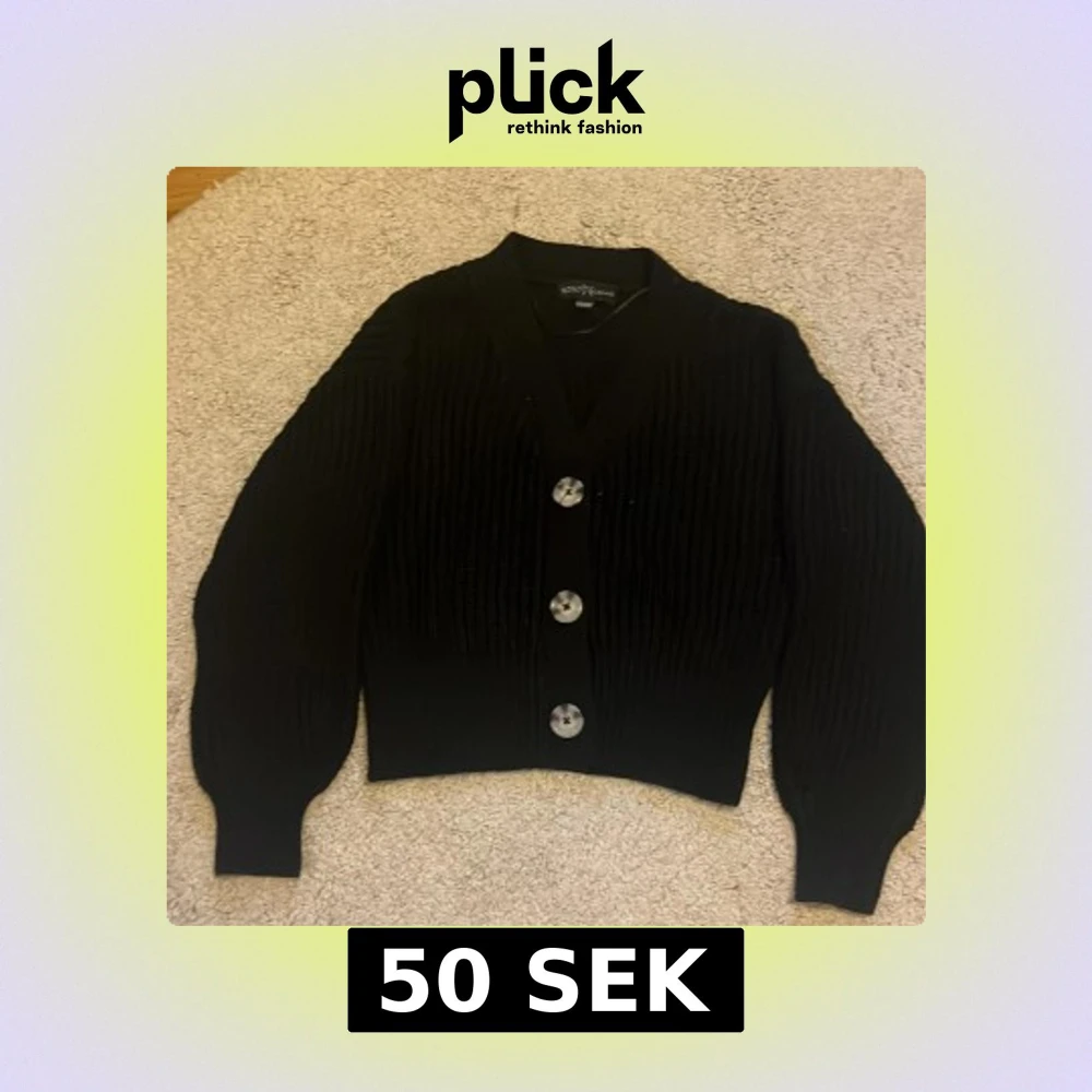 Säljer en svart ribbad kofta med tre stora silvriga knappar framtill. Koftan har långärmade ballongärmar och är croppad i modellen. Materialet är stickat och känns mjukt och skönt mot huden. Perfekt för lager-på-lager och snygg till jeans.