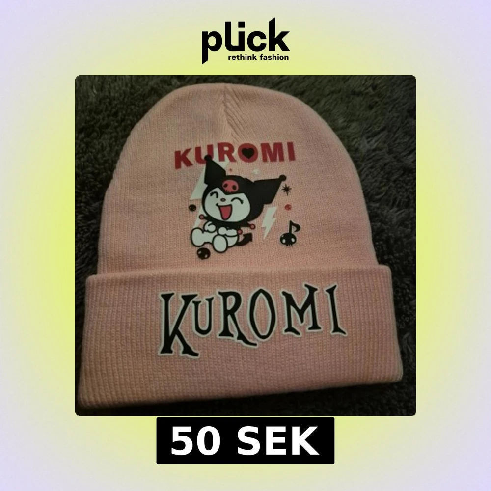 Söt rosa mössa med tryck av Kuromi från Sanrio. Mössan är stickad och har en uppvikt kant med texten 'Kuromi' i svart och vitt. Perfekt accessoar för dig som älskar kawaii-stil och vill sticka ut med en gullig och lekfull look.