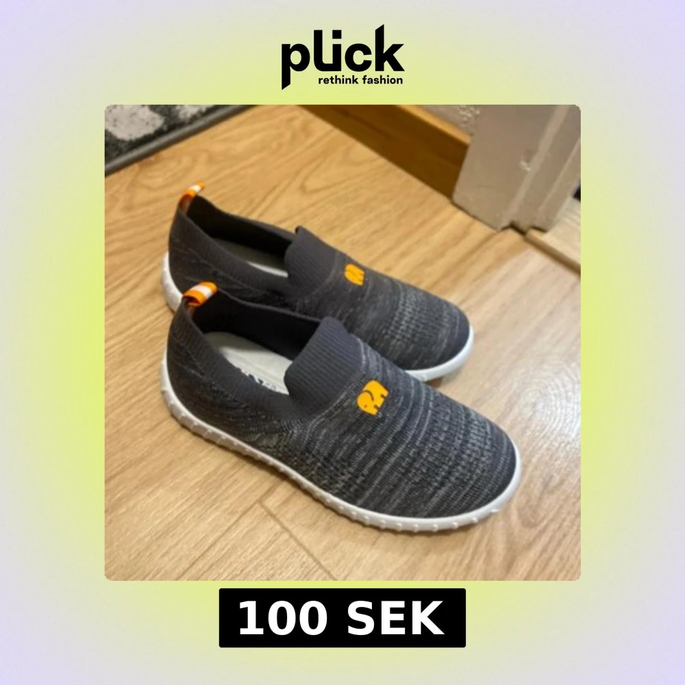 Snygga grå stickade sneakers med en orange elefantdetalj på ovansidan. Skorna har en vit sula och en praktisk slip-on design med en orange rand på hälen. Perfekta för en avslappnad stil. Helt nya och oanvända fast utan prislapp.
