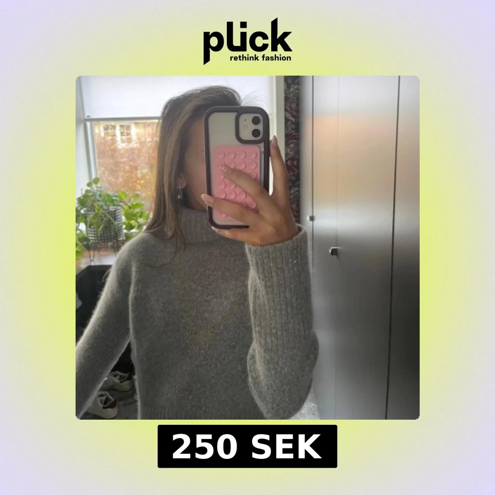 Säljer en grå polotröja med hög krage och långa ärmar. Tröjan är stickad i mjuk ull och har en loose passform med breda ribbade muddar vid ärmslut och nederkant. Perfekt för kyliga dagar och enkel att matcha med jeans eller kjol.
