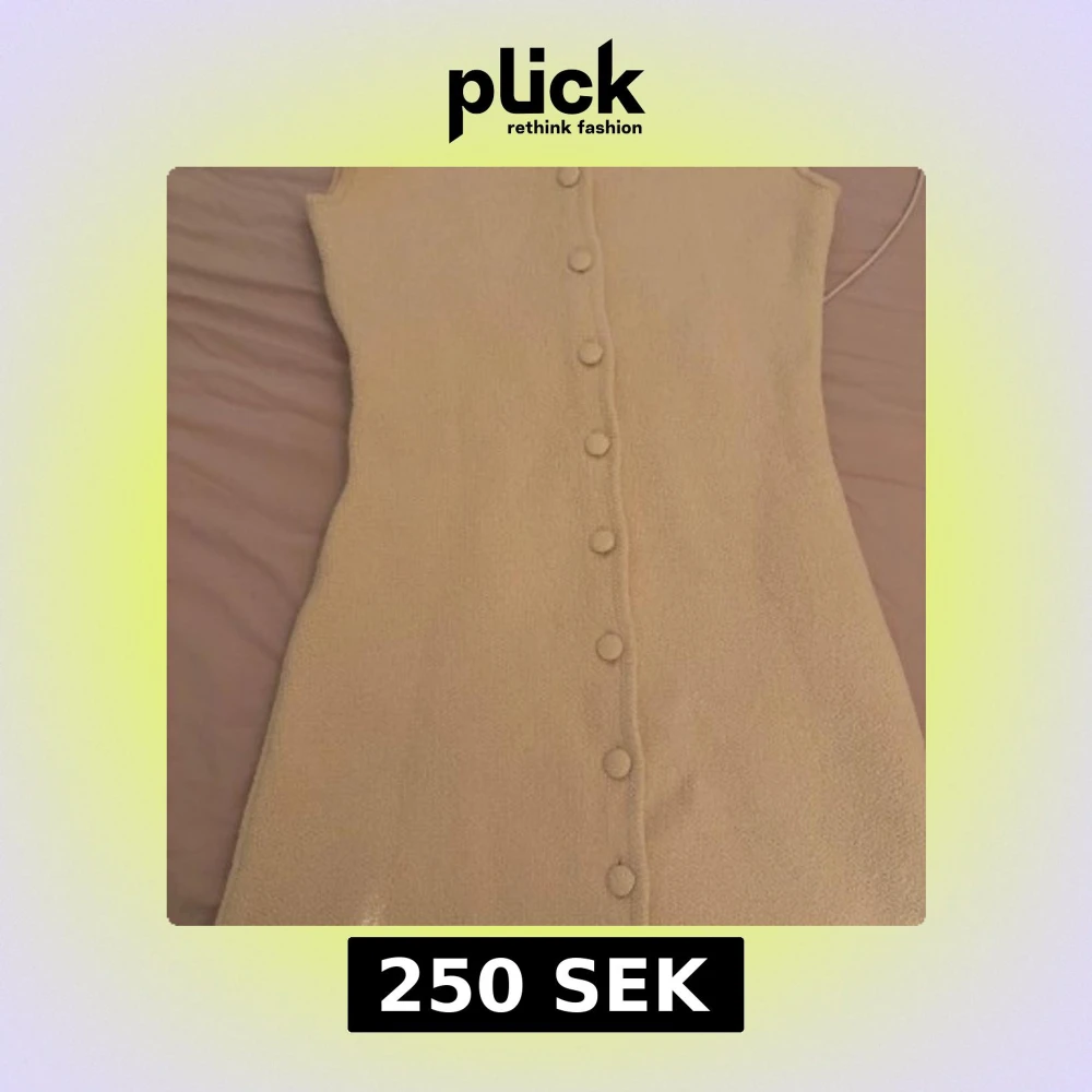 Supersöt beige klänning med ärmlös design och rund hals. Klänningen har en rak, kort siluett och är dekorerad med stora tygklädda knappar längs hela framsidan. Materialet är stickat och ger en mjuk och lite strukturerad känsla. Har aldrig använt klänningen.