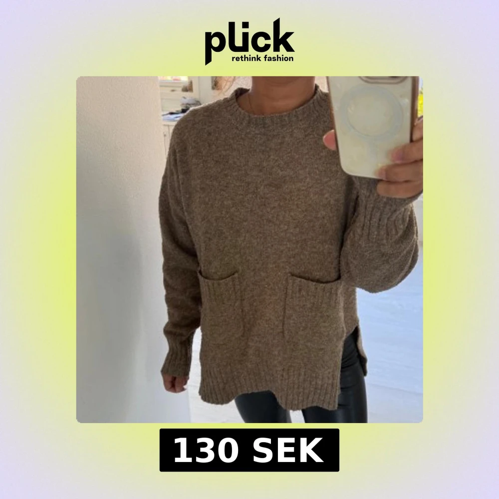 Mysig brun stickad tröja med två stora fickor framtill och ribbade muddar vid ärmslut och nederkant. Tröjan har en loose passform och lång ärm, perfekt för att chilla eller hänga med vänner. Rund hals och diskreta slitsar på sidorna ger extra stilpoäng.