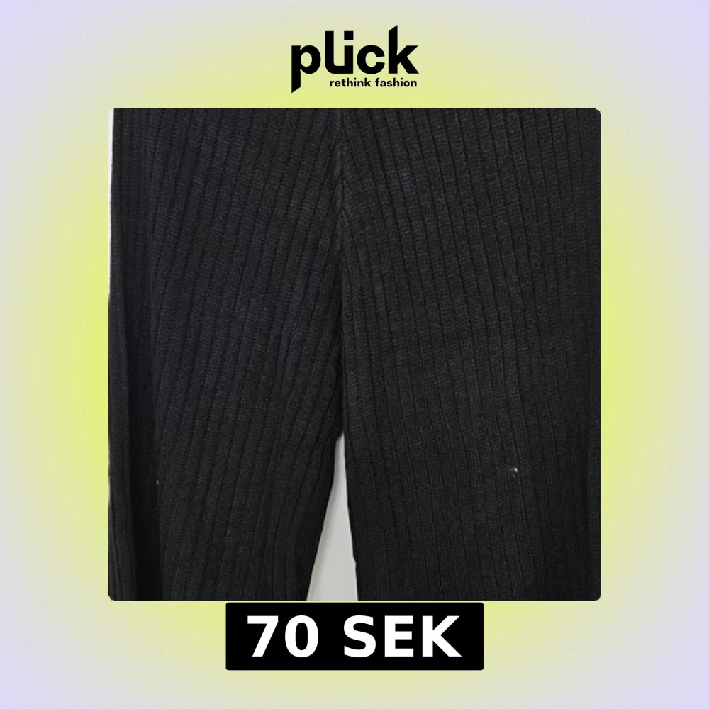 Säljer en svart stickad tröja med ribbad struktur och vita ränder vid halsringning och nederkant. Tröjan har lång ärm och en avslappnad passform, perfekt för lager-på-lager-stil.