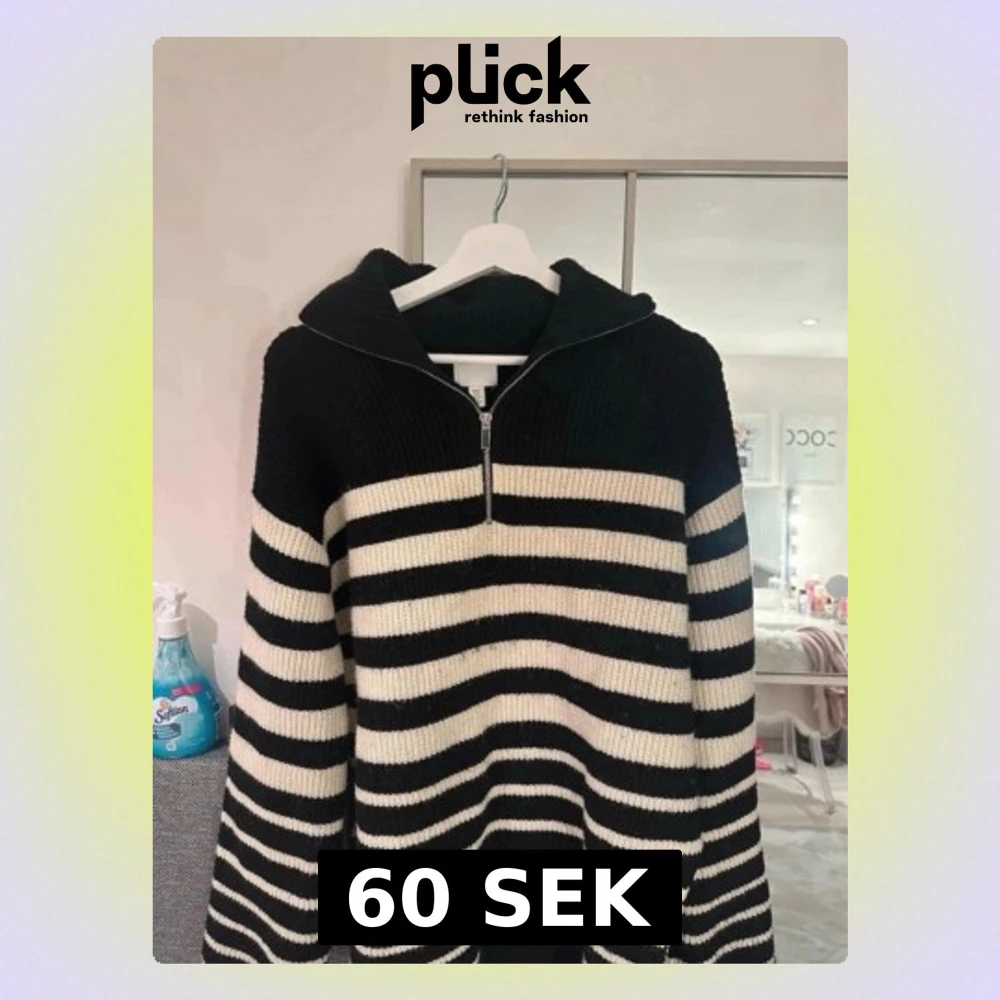 Säljer en svartvit stickad tröja med breda horisontella ränder och halv dragkedja framtill. Tröjan har en hög krage och långa ärmar. Perfekt för dig som gillar en avslappnad och trendig look.