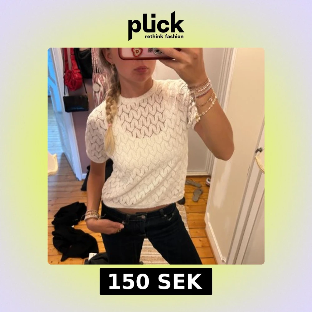 Säljer en vit stickad topp med korta ärmar och snyggt vågigt mönster. Perfekt för dig som gillar en fräsch och stilren look med lite twist.