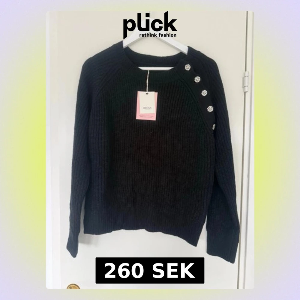 Snygg svart stickad tröja från Design Only med dekorativa blommiga knappar på axeln. Tröjan har rund halsringning, långa ärmar och ribbade muddar. Perfekt för dig som gillar en enkel men ändå unik look.