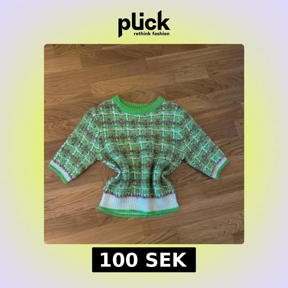 Säljer en unik stickad tröja i grönt och vitt med rutigt mönster. Tröjan har rund halsringning, trekvartsärm och ribbade muddar i grönt och vitt. Perfekt för dig som vill sticka ut med färg och mönster!