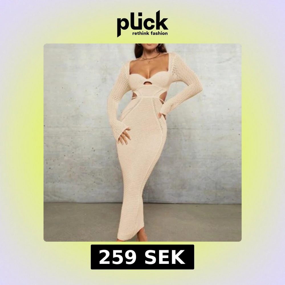 Superfin beige stickad långklänning med cut-outs i midjan, öppen rygg och snygg snörning bak. Klänningen har lång ärm och figurnära passform som framhäver siluetten. Perfekt för dig som vill sticka ut med en trendig och unik look. Storlek S (34/36), den är stretchig och exakt som min oranga klänning som jag la upp innan, endast använd ett tillfälle.