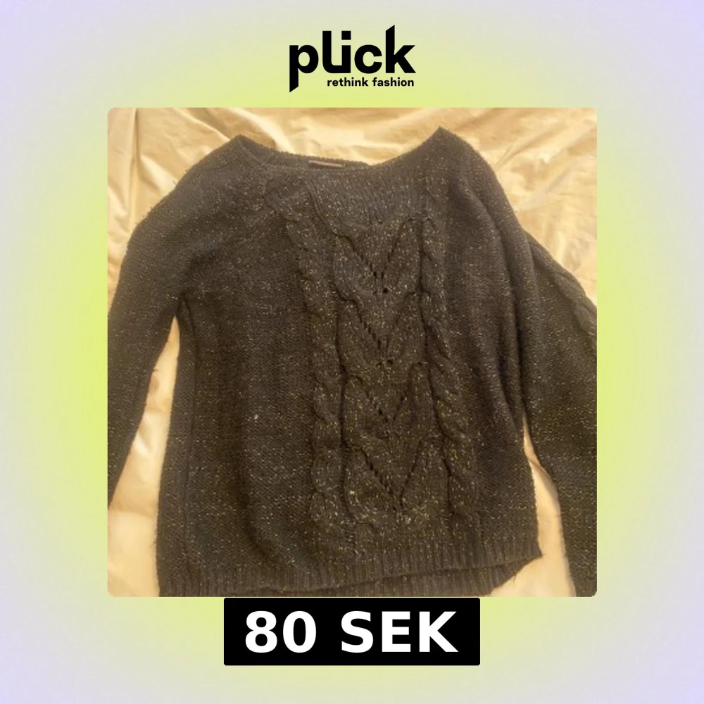 Säljer en svart stickad tröja med ett snyggt flätmönster framtill. Den har en subtil glittrig effekt som ger en extra touch. Perfekt för både vardag och speciella tillfällen. Snygg till en jeans kjol på sommaren.