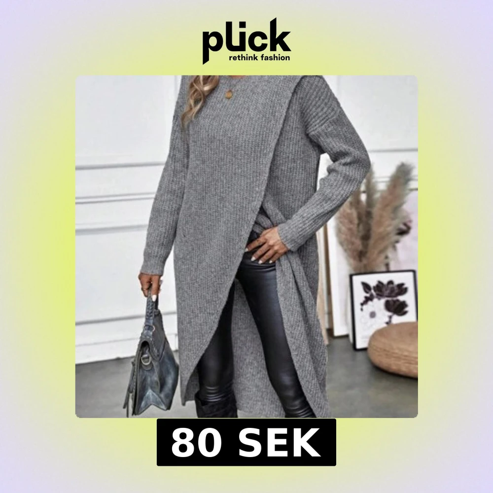Säljer en stilren grå stickad lång tröja med långa ärmar. Tröjan har en öppen design framtill och är ribbad för extra textur. Använd 1-2 gånger.