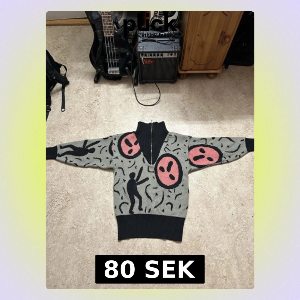 Unik grå stickad tröja med svarta och rosa grafiska motiv, halvzip och hög krage. Tröjan har svarta siluetter och stora rosa ansikten, samt breda svarta muddar vid ärmslut och midja. Perfekt för dig som gillar statement-plagg och kreativ design.