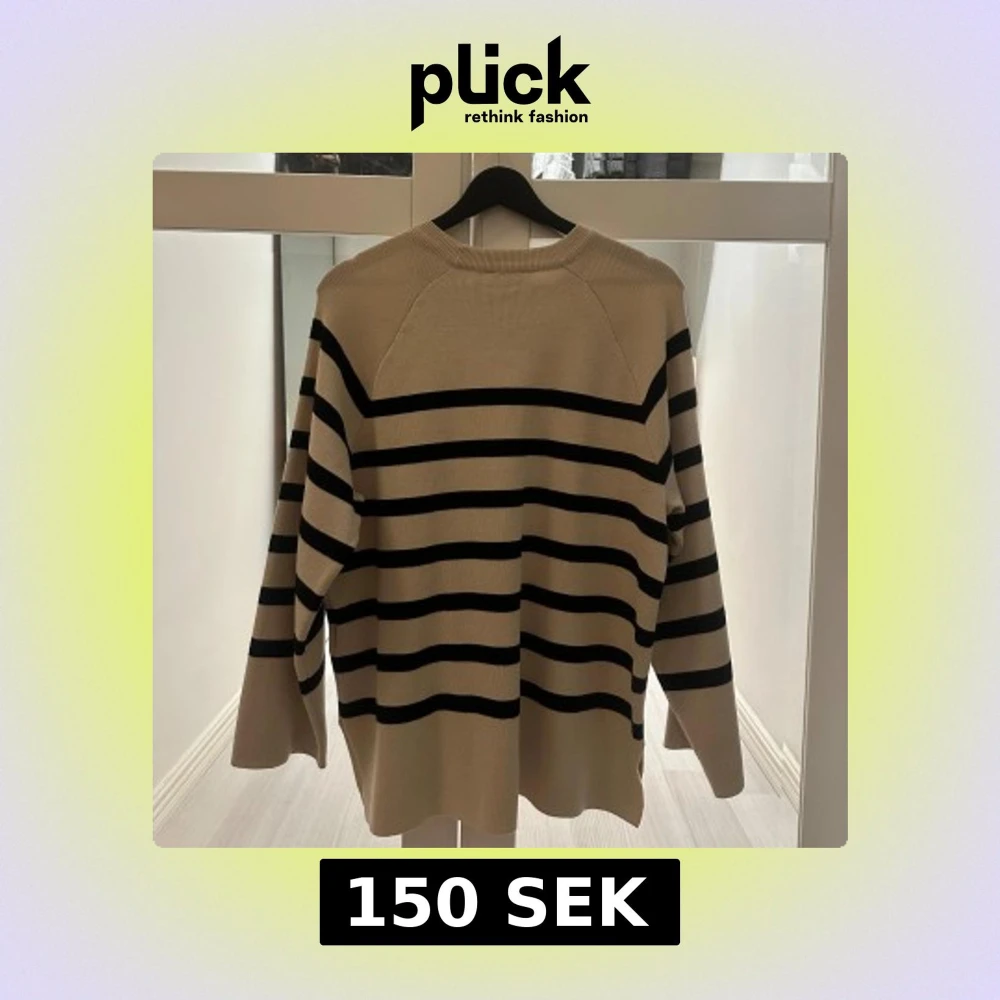 Snygg stickad tröja i beige med svarta horisontella ränder. Tröjan har rund halsringning och långa ärmar, perfekt för lager-på-lager. Den har en avslappnad passform och är superenkel att styla till jeans eller kjol.