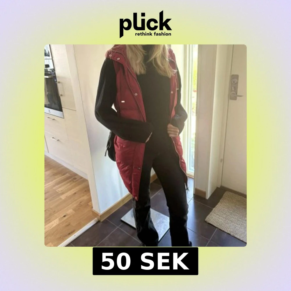 Säljer en lång, vinröd dunväst med huva och dragkedja framtill. Västen har quiltad design, snörning i huvan och praktiska fickor med dragkedja. Perfekt att slänga över en stickad tröja för extra värme. Snygg och enkel att styla till höst och vinter. Stor I storleken.