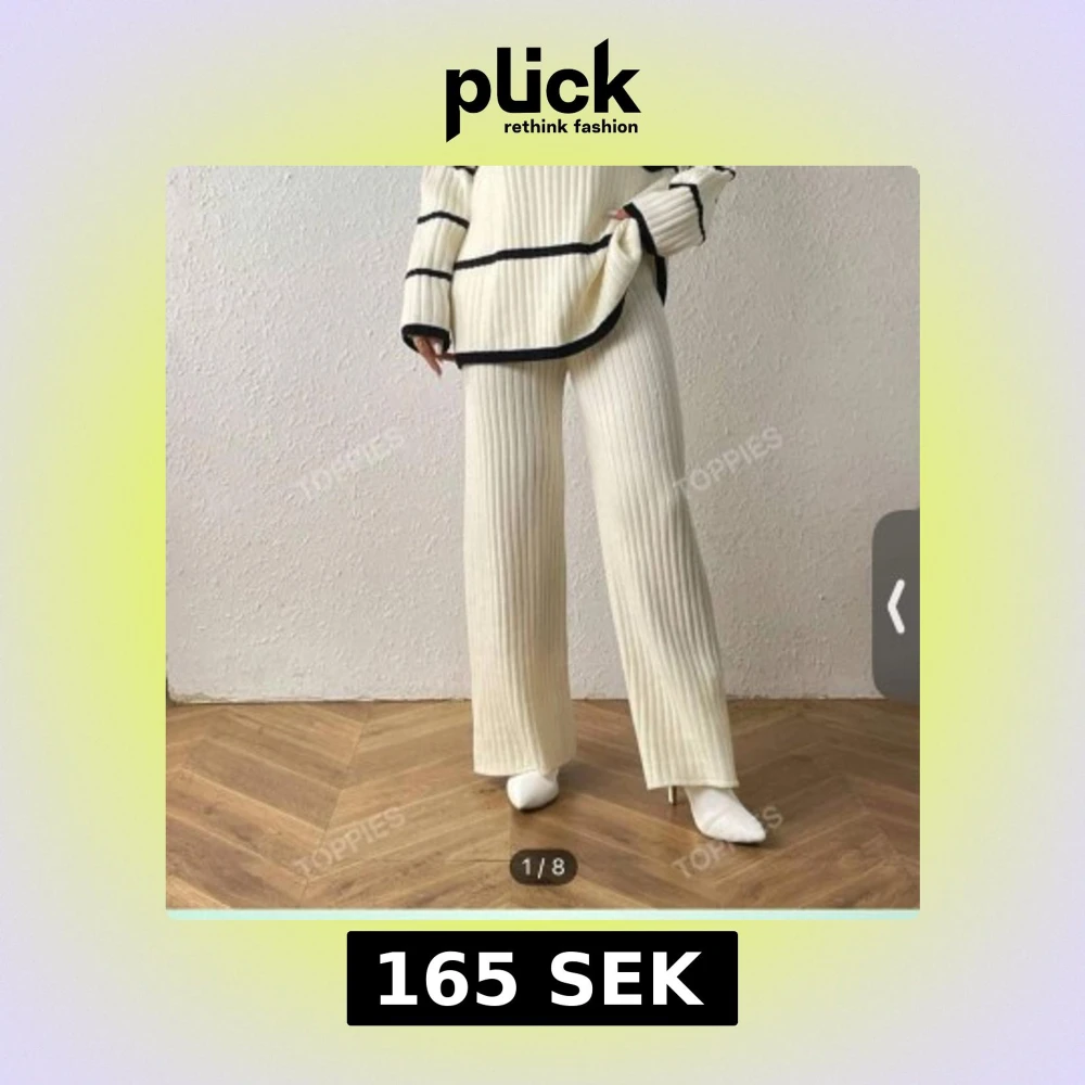 Snygg vit ribbad byxa och tröja från shein med svarta ränder. Tröjan har långa ärmar och en avslappnad passform, perfekt för en stilren look. Det är storlek M på den men hade nog sagt att den är både S och M