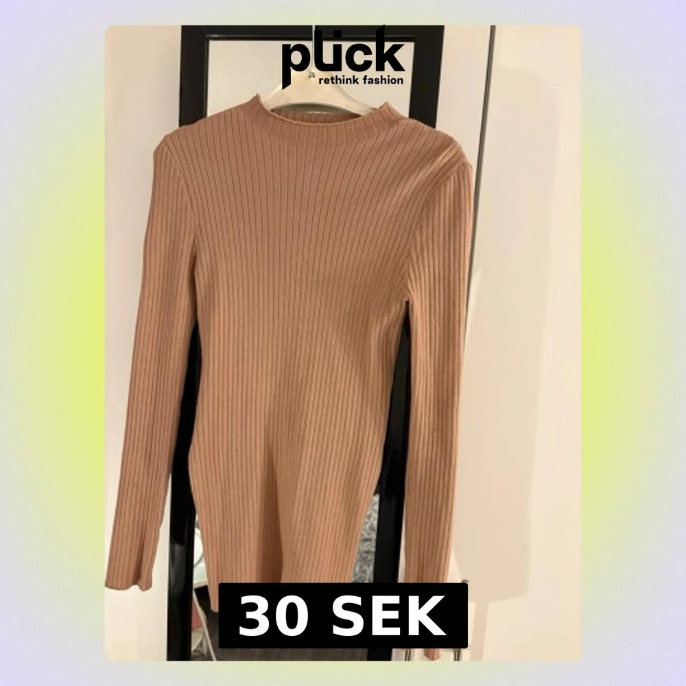 Säljer en beige ribbad långärmad tröja med slits på sidorna. Tröjan har en rundad hals och är tillverkad i ett mjukt stickat material som sitter snyggt på kroppen.