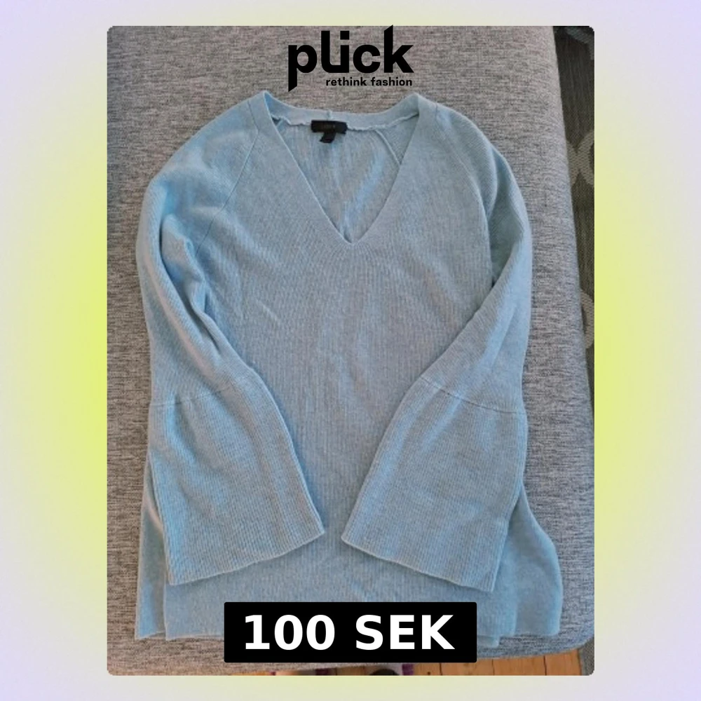 Ljusblå stickad tröja från J.crew med v-ringning och vida ärmar. Tröjan har en mjuk, ribbad struktur och är tillverkad i ett tunt, bekvämt material. Perfekt för lager på lager och enkel att styla till olika outfits.