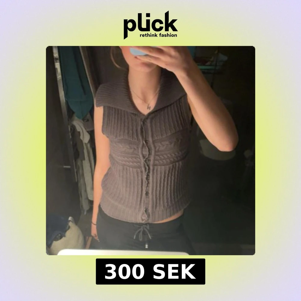 Säljer en grå stickad väst med bred krage och snygga knappar framtill. Västen har ett ribbat mönster och dekorativa flätade detaljer över bröstet. Perfekt att styla över en t-shirt eller skjorta för en cool look.