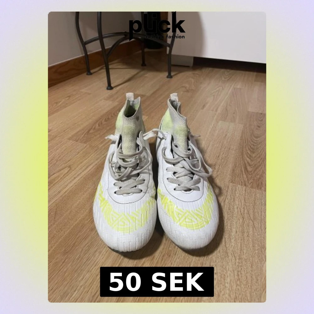 Säljer ett par fotbollsskor från Twingo i vitt med gula detaljer och mönster. Skorna har snörning och en stickad, strumpliknande hög krage för extra stöd. Snyggt mönster på ovansidan och logga på sidan. Perfekta för dig som vill sticka ut på planen.