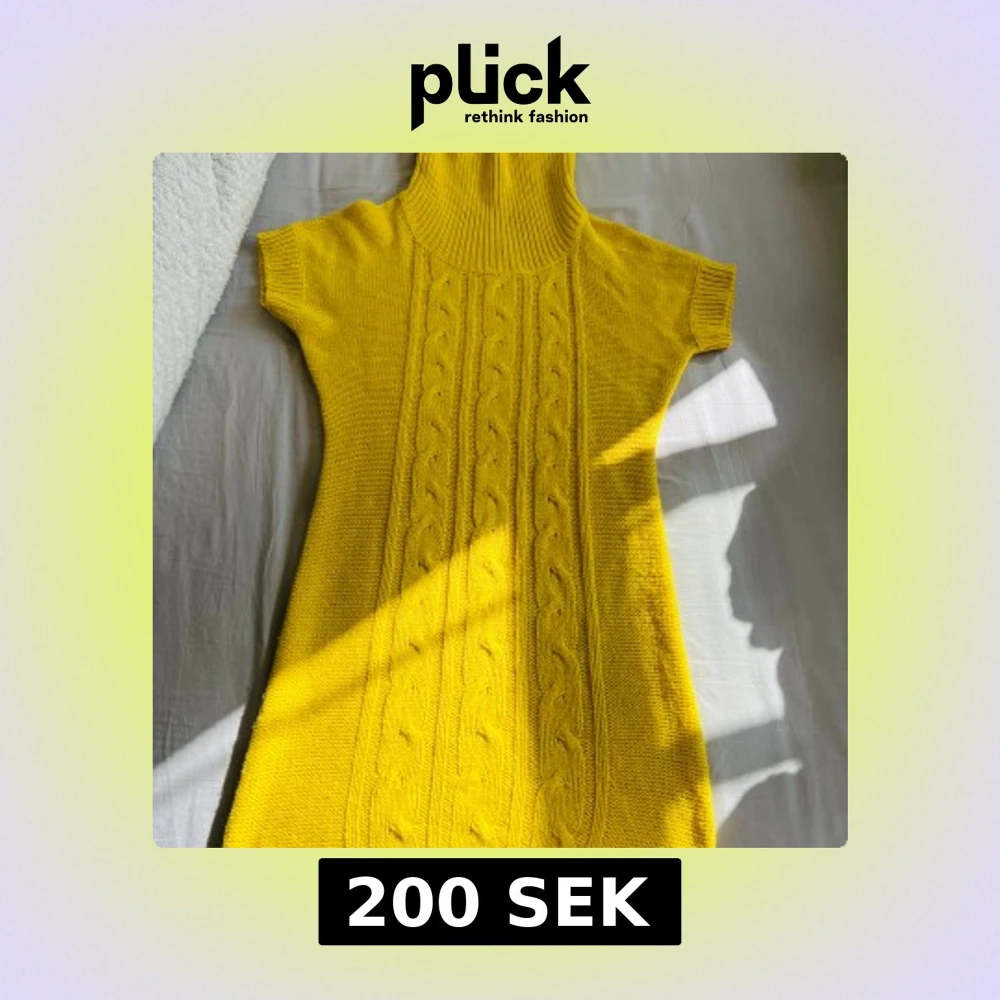 Säljer en gul stickad klänning med polokrage och korta ärmar. Klänningen har ett fint kabelstickat mönster framtill och är i en mjuk, varm kvalitet. Perfekt för dig som vill ha något färgglatt och mysigt.