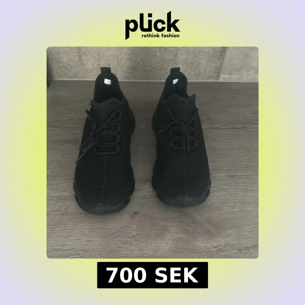 Säljer ett par helsvarta sneakers med stickad ovandel och cool, vågig sula. Skorna har snörning och en sportig look, perfekt för dig som gillar streetstyle. Märkt med 'DESIGNED 2020' på hälen. Riktigt lätta och bekväma att bära.