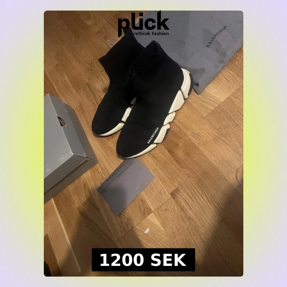 Säljer ett par svartaSpeed Trainer sneakers i storlek 43. Skorna har en stickad ovandel i stretchig textil och en chunky vit och svart sula med -logga på sidan och hälen. Supersnygg och futuristisk design som är riktigt bekväm.