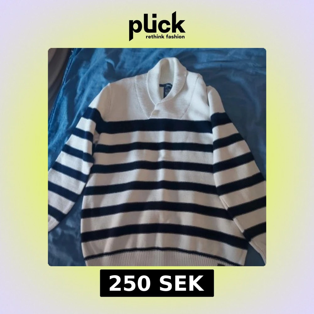 Säljer en vit stickad tröja med marinblå horisontella ränder och bred krage. Tröjan har långa ärmar och ribbade muddar vid ärmslut och nederkant. Perfekt för kyliga dagar och en klassisk stil.