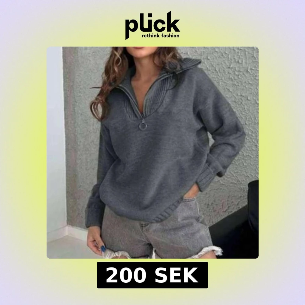 Säljer en oversized stickad tröja med half zip och hög krage. Finns i både mörkgrått och beige( säljer båda för 200kr ) Tröjan har långa ärmar, ribbade muddar och en avslappnad passform.
