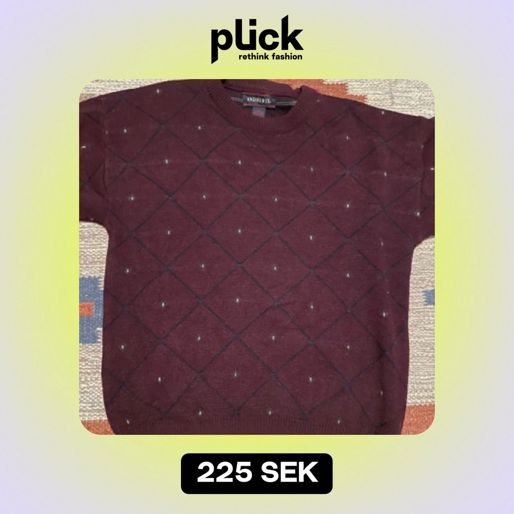Stickad vinröd tröja med mönster köpt second-hand. Helt okej passform på mig som är 178