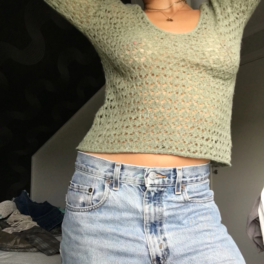 Grön stickad tröja med djup V-ringning i rygg och fram! För fler bilder/ mer info skriv i DM. Fraktar endast och betalning via swisch📲
