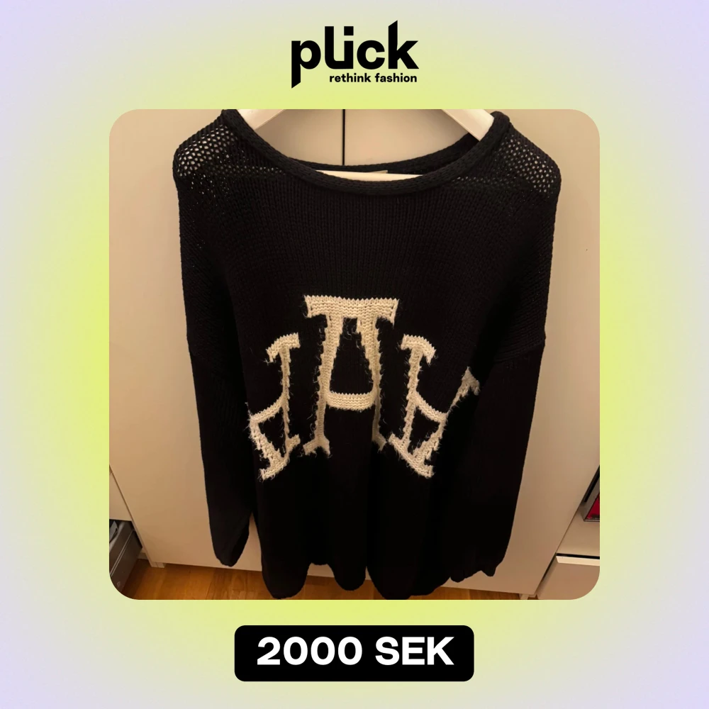 !!!VÄLDIGT OVERSIZED PASSAR SOM XL!!! Säljer en snygg svart stickad tröja från Acne Studios med ett stort vitt mönster framtill. Tröjan har en avslappnad passform och långa ärmar, perfekt för kyliga dagar. Den är i mycket bra skick och redo för en ny ägare!