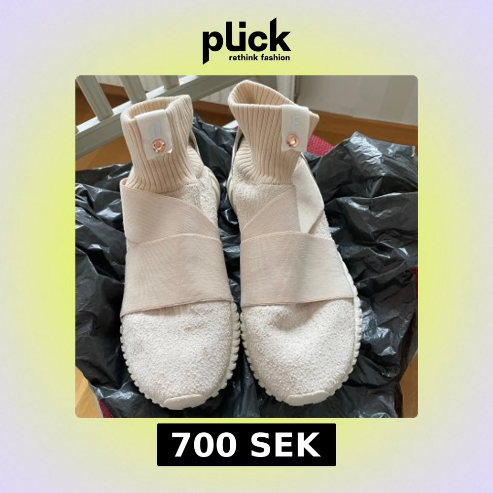 Säljer ett par unika Adidas Overkill x Fruition Tubular Elastic sneakers i beige. Skorna har en stickad strump-liknande ovandel, breda elastiska band över foten och en chunky sula. Perfekta för dig som gillar en modern och sportig look. Storlek 39 1/3.