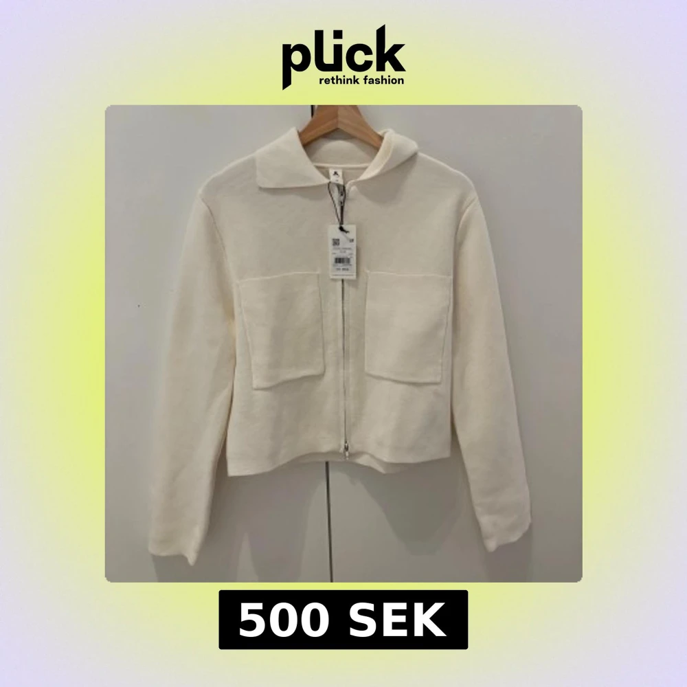Säljer en krämvit stickad kofta från Åhlens med två stora fickor framtill och dragkedja. Koftan har en klassisk krage och långa ärmar. Perfekt för lager-på-lager och enkel att matcha med olika outfits. Helt ny oanvänd med prislapp.