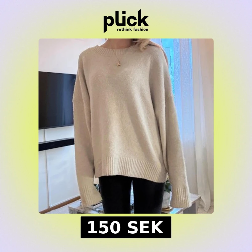 Supermysig beige stickad tröja med oversized passform och långa ärmar. Tröjan har breda ribbade muddar vid ärmslut och nederkant samt rund halsringning. Perfekt för chill dagar och när du vill ha något extra comfy.