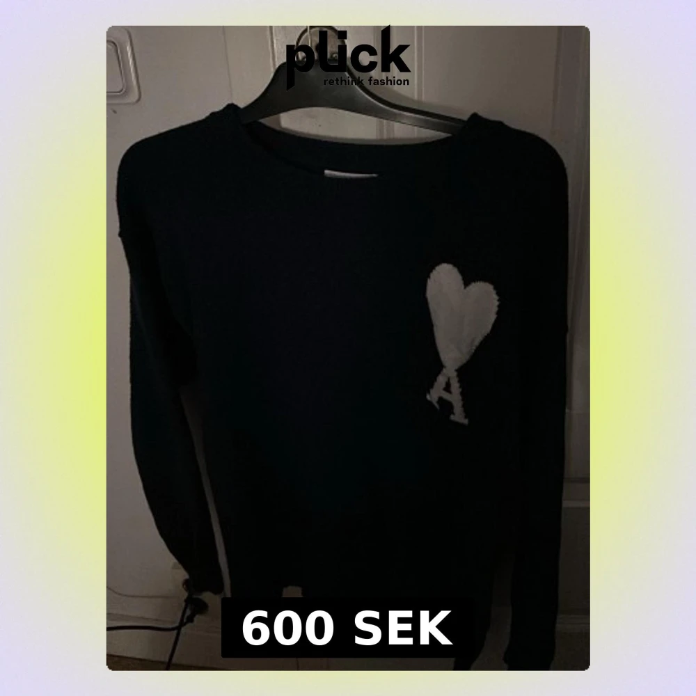 Säljer en svart stickad tröja från Ami Paris med deras ikoniska vita hjärta och bokstaven A broderat på bröstet. Tröjan har rund halsringning och långa ärmar. Perfekt för dig som gillar stilrena och trendiga plagg.