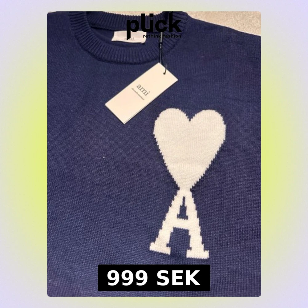 Säljer en blå stickad tröja från Ami Paris med ett stort vitt hjärta och bokstaven A på bröstet. Tröjan har rund halsringning, ribbade muddar och är tillverkad i mjukt material. Perfekt för dig som gillar stilrena detaljer och ikoniska loggor. Skriv om du vill snacka om priset!