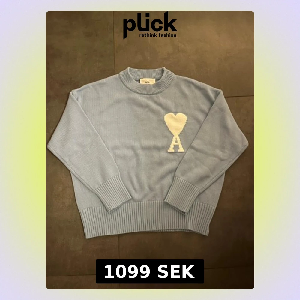Snygg ljusblå stickad tröja från Ami med ribbade muddar och rund hals. På bröstet finns ett stort vitt hjärta med bokstaven A under, vilket ger en unik och trendig look. Perfekt för dig som gillar stilrena detaljer och mjuka material.