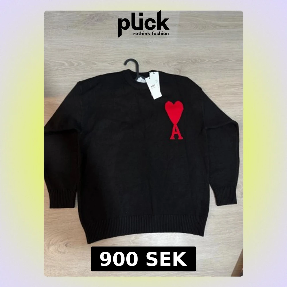 Svart stickad tröja från Ami Paris med röd hjärtlogga och bokstaven A på bröstet. Tröjan har rund halsringning, ribbade muddar och nederkant. Perfekt för dig som gillar stilrena plagg med en twist.