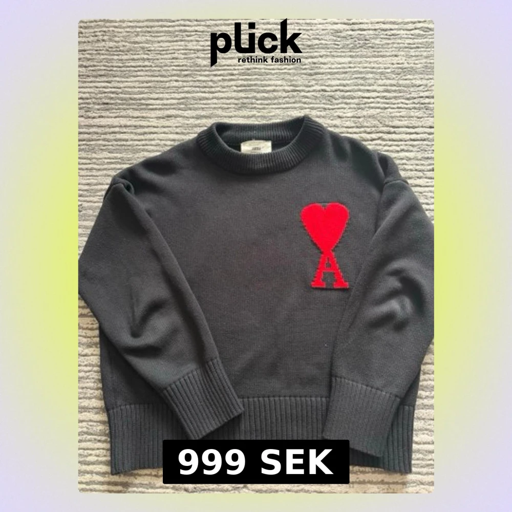 Snygg svart stickad tröja från Ami Paris med röd hjärtlogga och bokstaven A på bröstet. Tröjan har rund hals, ribbade muddar och nederkant. Perfekt för dig som gillar stilrena plagg med en twist.