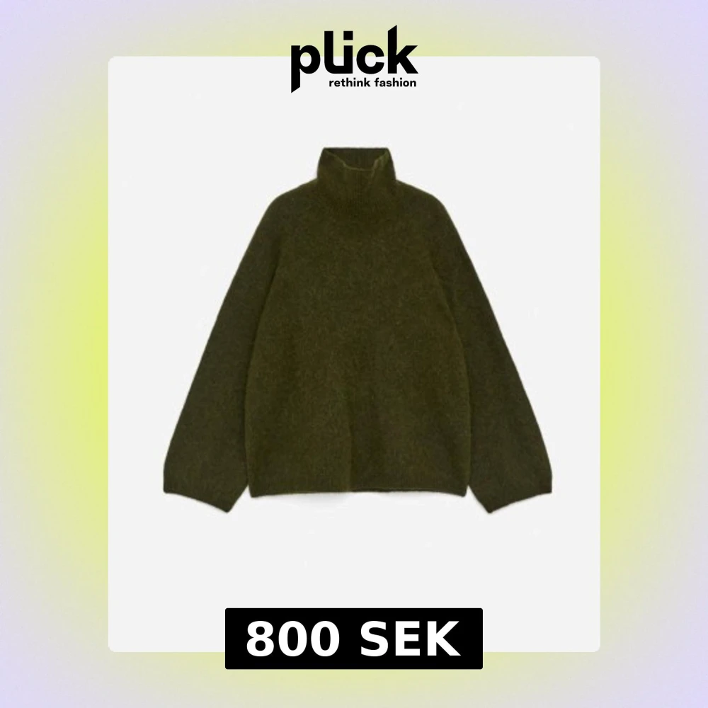 Mysig olivgrön polotröja i ull med hög krage och långärmad passform. Tröjan har en loose och oversized siluett, perfekt för att hålla sig varm under kyliga dagar. Ribbstickad vid halsen och ärmsluten för extra komfort. Andvänd endast en gång!!