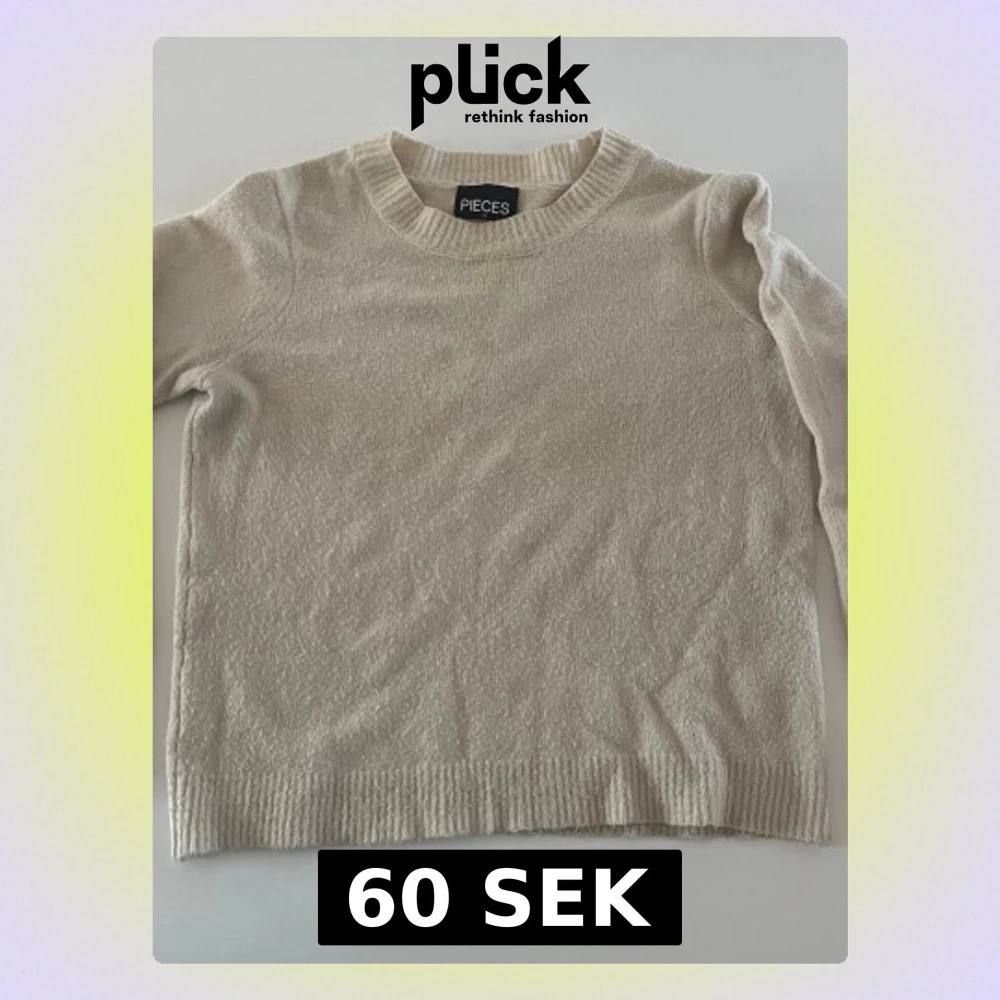 En stilren beige stickad tröja från Pieces med rund halsringning och ribbade muddar vid ärmslut och nederkant. Perfekt att matcha med jeans eller kjol för en enkel och snygg look. Lite utöjd pga användning men fortfarande fin