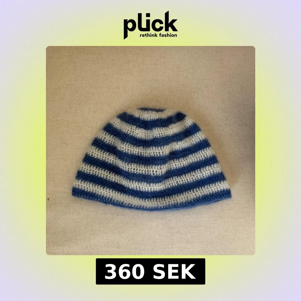 Virkad mössa med breda blå och vita ränder. Mjuk och fluffig känsla, perfekt för dig som gillar en chill och avslappnad stil. Passar dig som vill ha något enkelt men ändå med lite edge. Gjort i alpaca garn