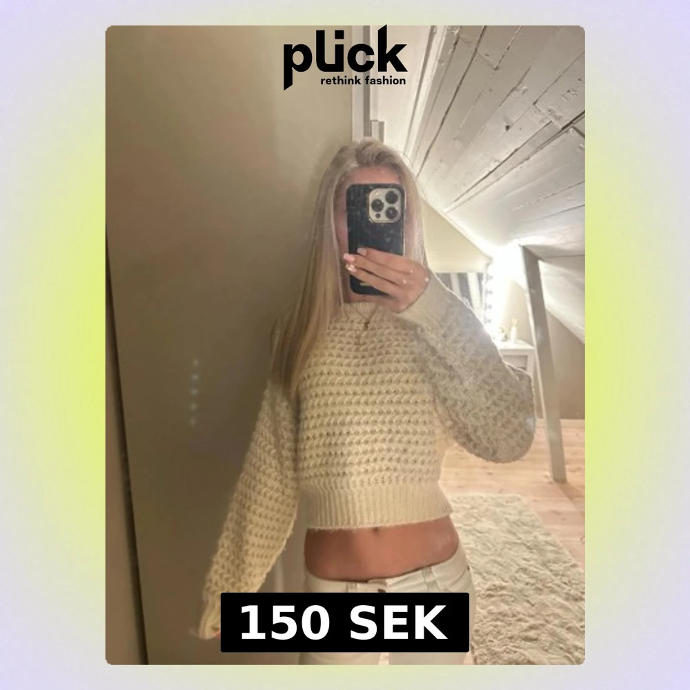 Supermysig croppad stickad tröja i beige med grovstickat mönster och långa ärmar. Perfekt till höst och vinter för en chill och trendig look. Tröjan har bred mudd nertill och vid ärmslut för extra comfy känsla.