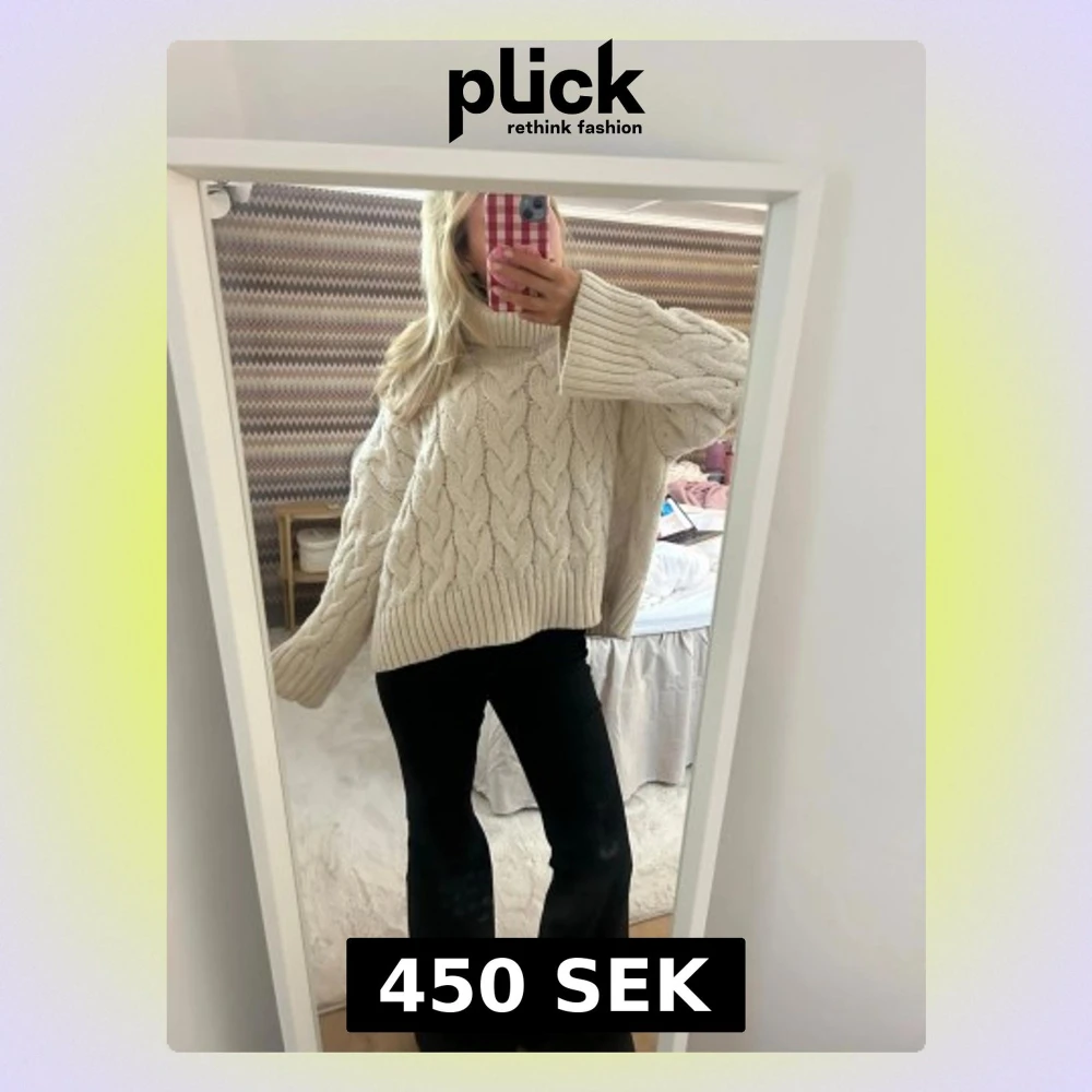 Säljer en oversized beige kabelstickad polotröja med breda ärmar och hög krage. Tröjan har ett grovt stickat mönster och är perfekt för kyliga dagar. Supermysig och lätt att styla med jeans eller leggings.