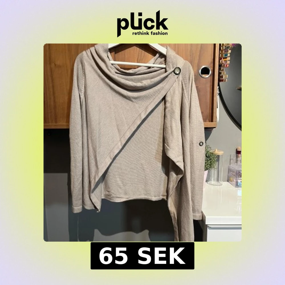 Snygg beige omlottkofta med lång ärm och cool knappdetalj vid axeln. Koftan har en avslappnad passform och är tillverkad i ett mjukt, stickat material. Perfekt för lager-på-lager och chill dagar.