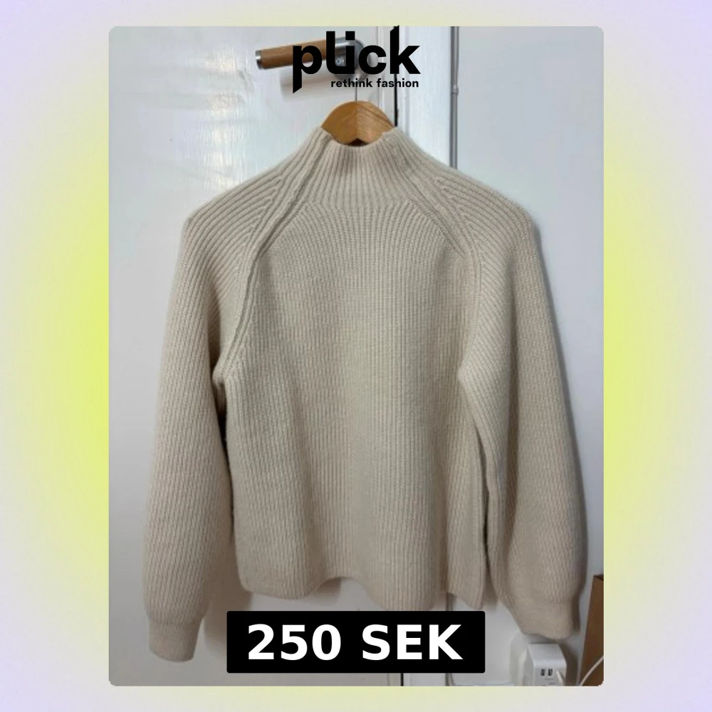 Säljer en beige ribbstickad tröja med liten låg hög krage och långa ärmar. Mjuk och super mysig skön stickad tröja, från H&M aldrig använd utan prislapp. Strl XS kan passa S också då den är väldigt bekväm