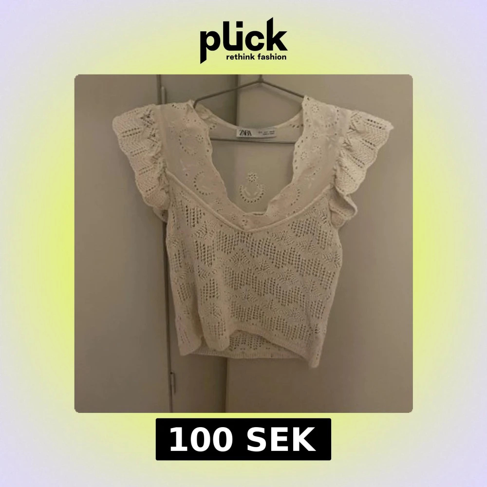 Säljer en superfin beige blus från Zara med spetsdetaljer och volang vid axlarna. Blusen har v-ringad hals och är ärmlös med broderade mönster och luftig stickad känsla. Perfekt för dig som gillar romantisk och boho stil!