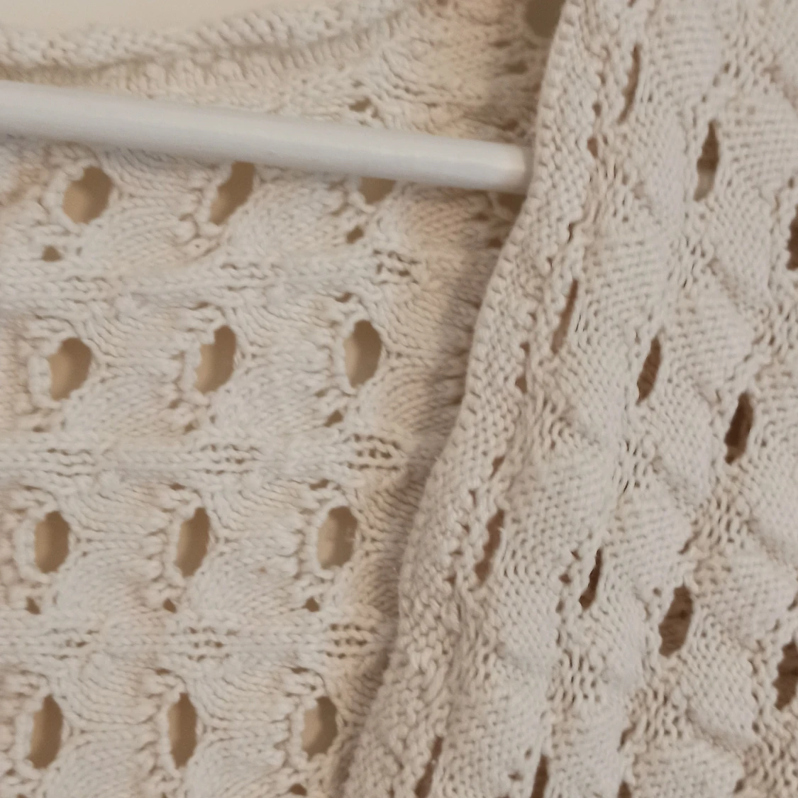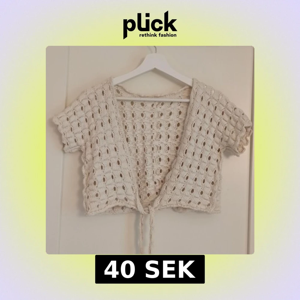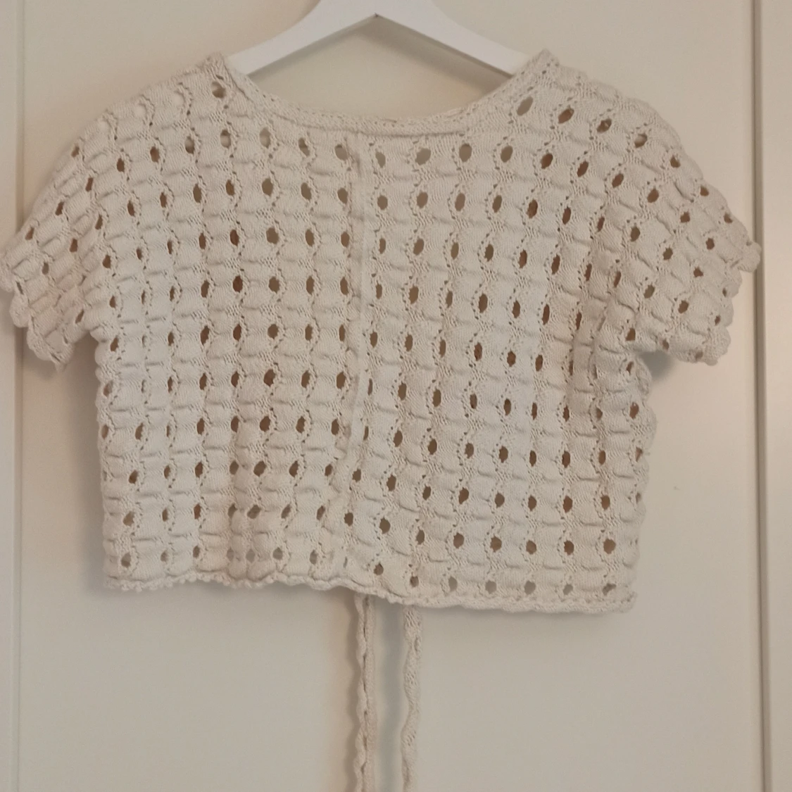 Superfin beige bolerotopp i stickat material med korta ärmar och knyt framtill. Toppen har ett hålmönster över hela och är croppad i modellen. Perfekt att slänga över ett linne eller klänning💕 passar XS/S
