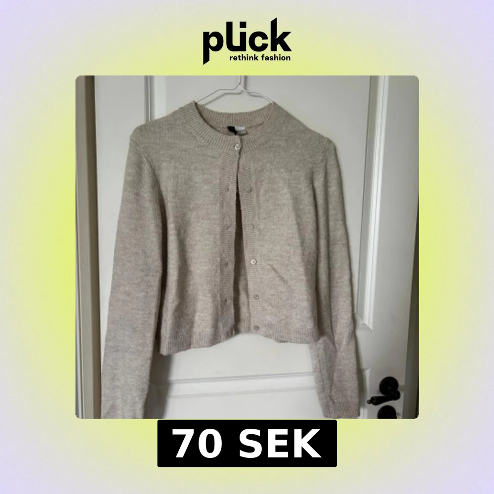 Mysig beige stickad kofta från H&M i storlek S. Koftan har rund halsringning, ribbade muddar och knäppning framtill med matchande knappar. Perfekt för lager-på-lager och chill höst- och vinterstil.