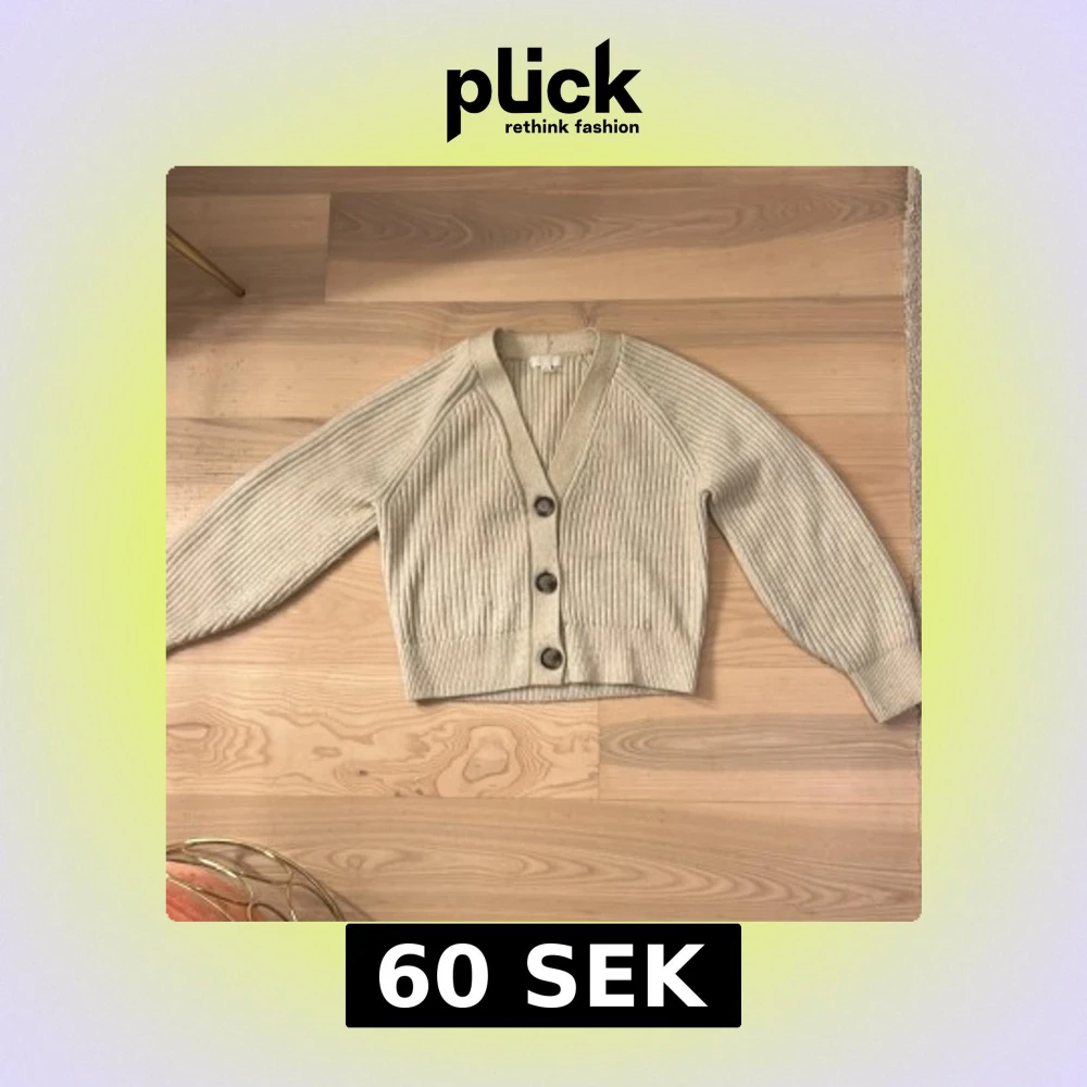 Säljer en mysig beige stickad kofta från H&M. Koftan har en v-ringad design med stora knappar framtill och ribbade detaljer. Perfekt för kyliga dagar!